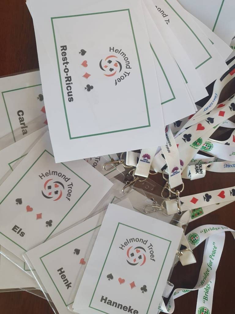 De badges voor onze gastvrouwen en de bag tags voor de tasjes waarmee de bridgemates naar en van de kroegen vervoerd worden zijn klaar. De organisatie prijst zich gelukkig met een overschrijding van het max. aantal inschrijvingen. Dat betekent nog meer gezelligheid en reuring rondom de Markt op 3 september!